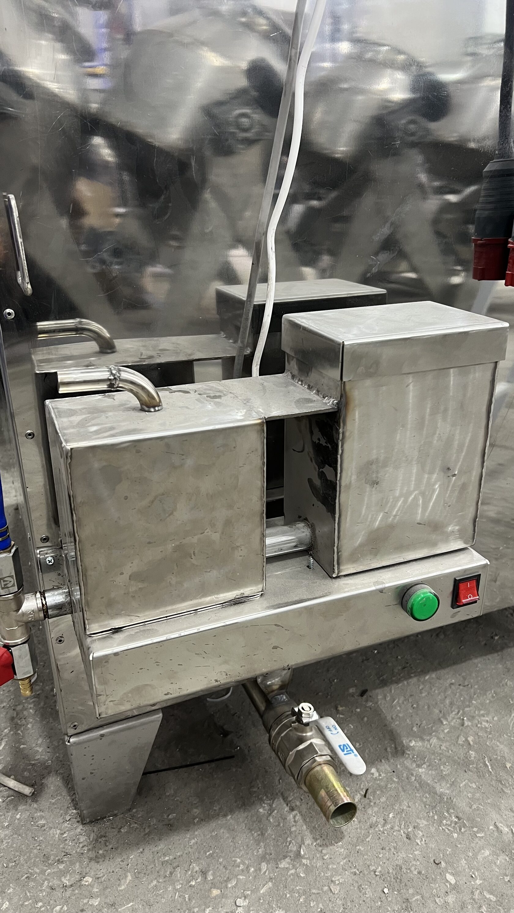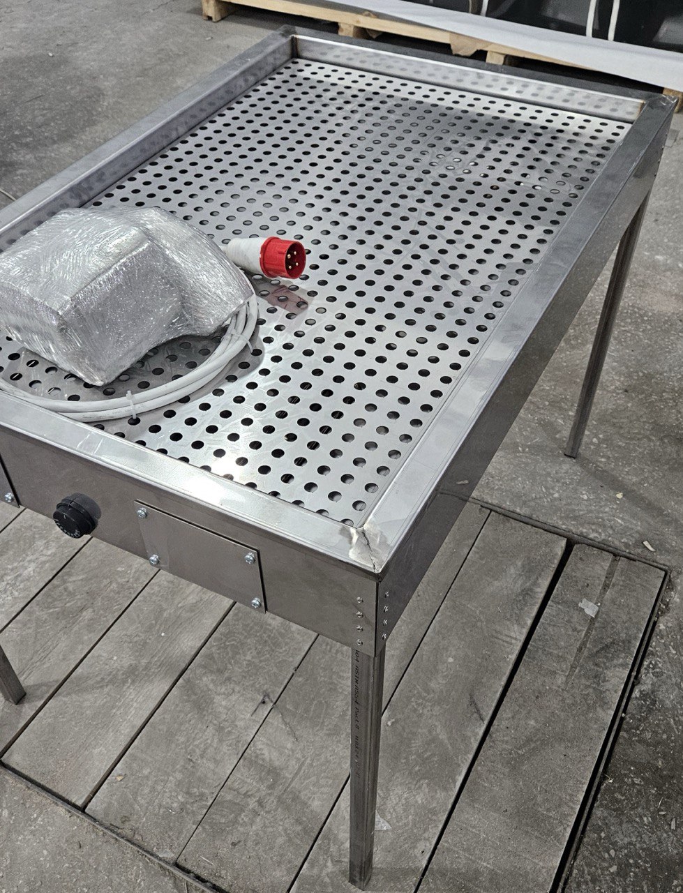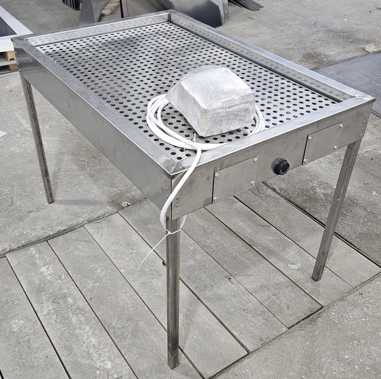 Описание: Профессиональный стол для подваривания мяса, полностью выполненный из нержавеющей стали. Конструкция предназначена для предварительной термической обработки мясных продуктов, для смягчения шкуры, перед этапом копчения.