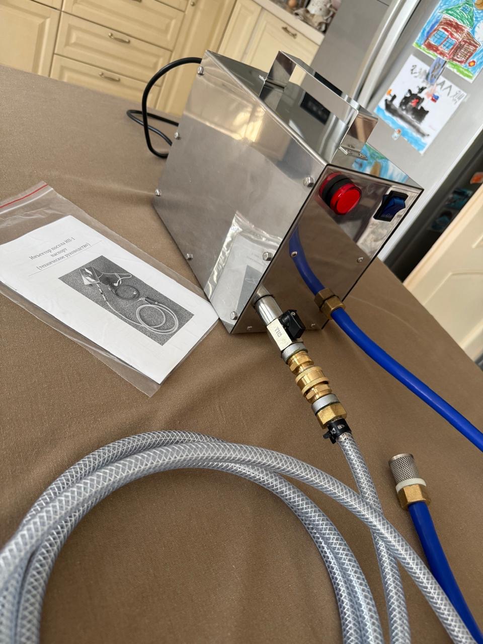Инъектор для мяса с самостоятельным забором жидкости. Корпус инъектора сделан из нержавеющей стали, уровень забора жидкости до 2 метров. -производительность 5 литров в минуту -рабочее давление до 5 АТМ -включение автоматическое по давлению в системе