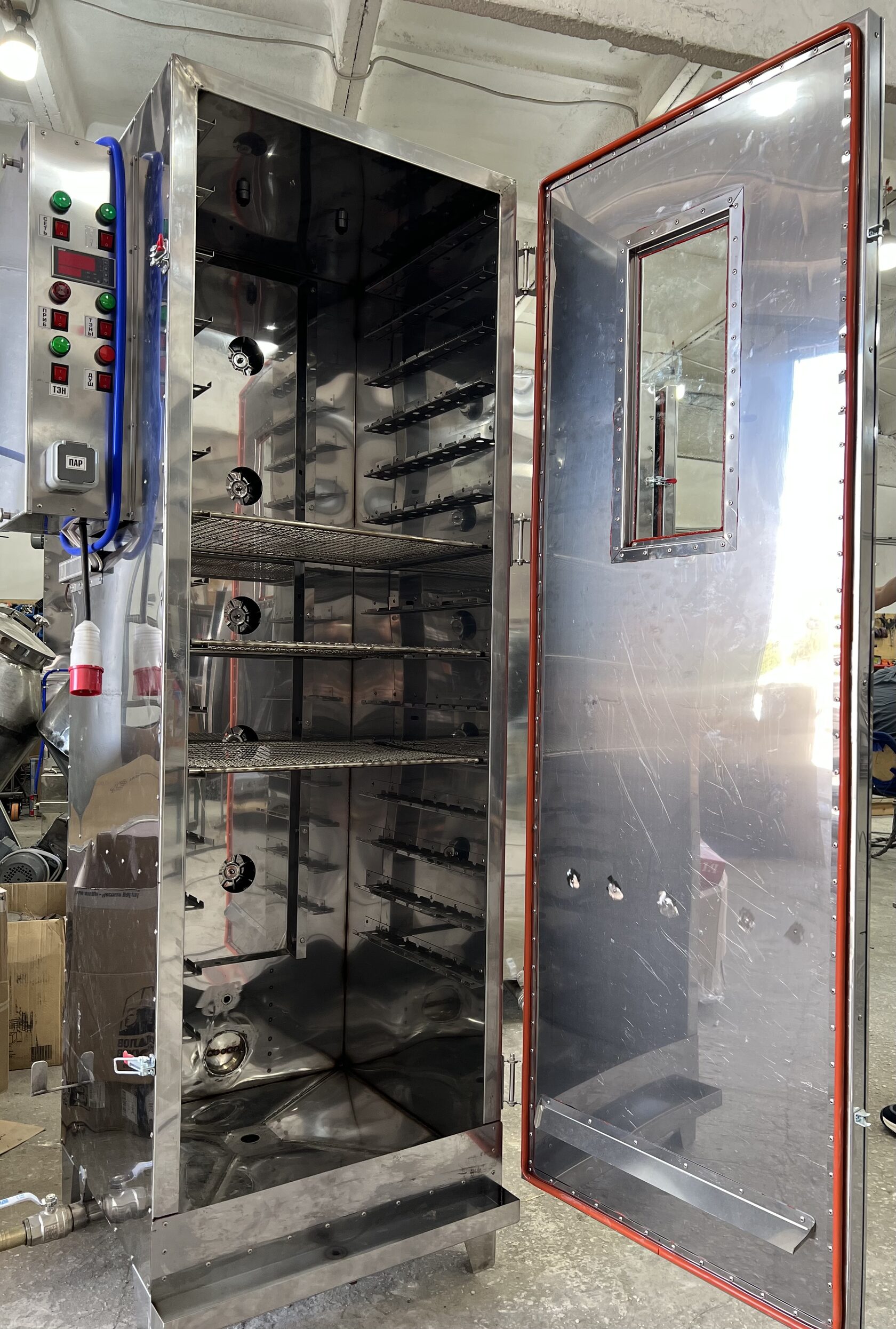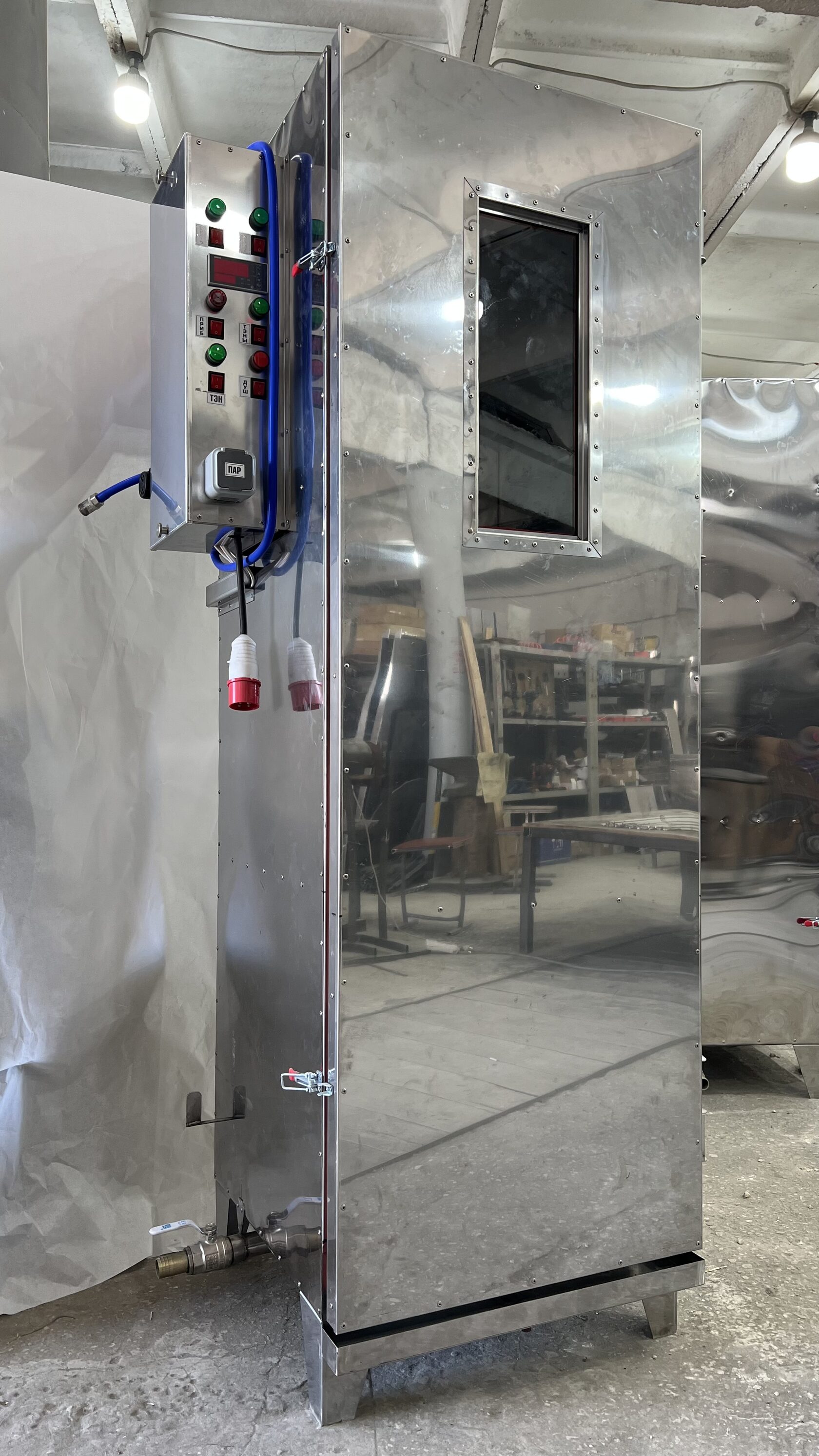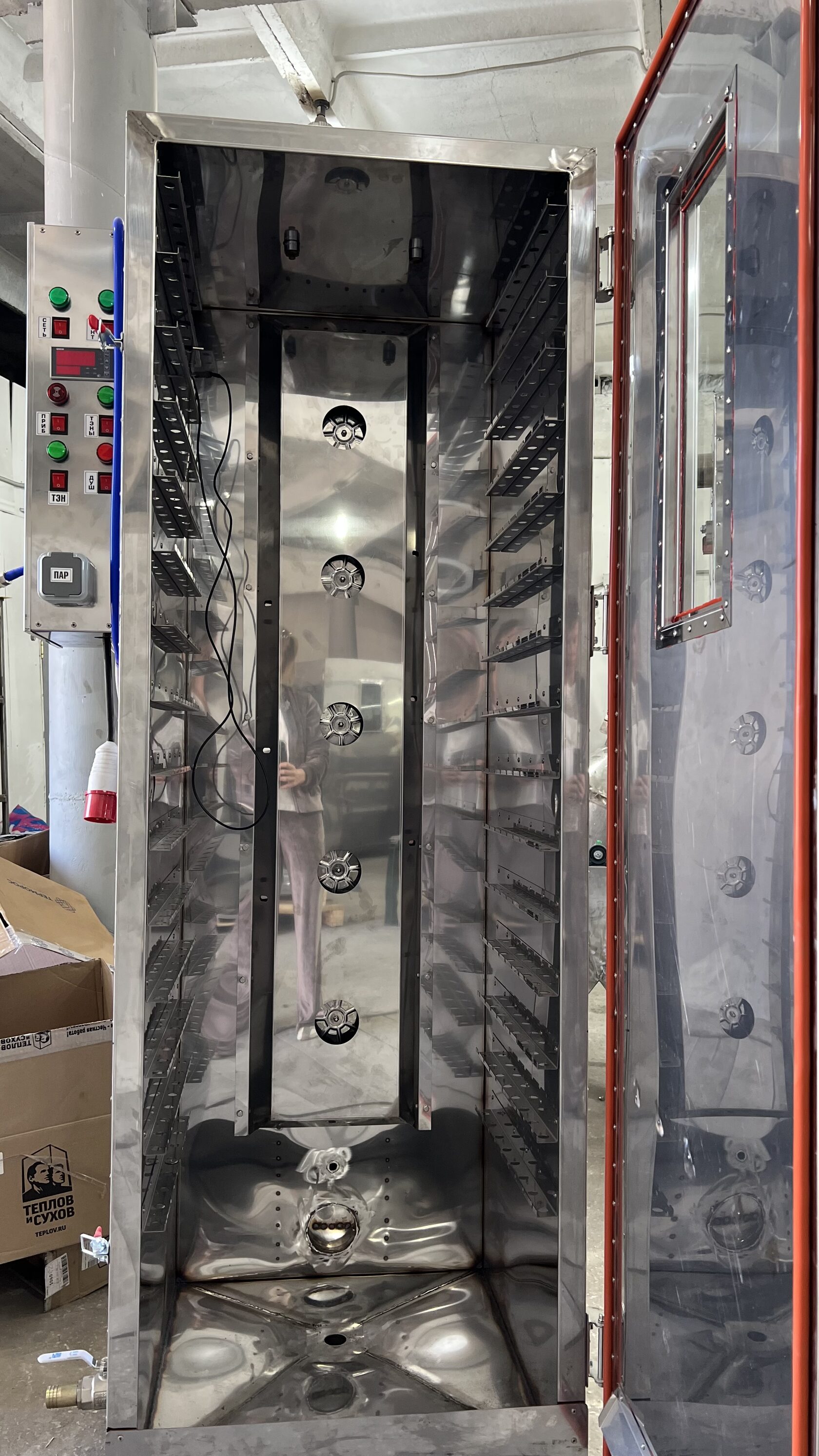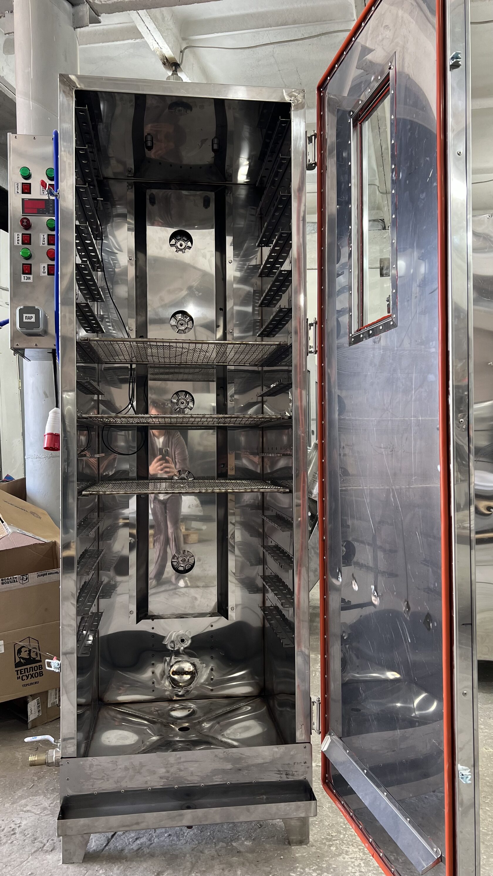 Размеры камеры внутри: -ширина 550мм -глубина 550мм -высота 1800мм Камера на 544 литра Обшитая с наружи нержавейкой , стенка толщиной 40мм утеплена , что позволяет работать при минусовых температурах. Хорошо справляется с сушкой варкой и копчением. Оборудована : -щитовой 380в с возможностью подключения на 220в (потребление камеры 6кВт + парогенератор 2кВт) -прибором на 2 датчика: t°продукта и t°камеры, (камера отключается при достижении заданной температуры) - 1 форсунка для душифрования и мойки камеры - насосом повышения давления -кассетным дымогенератором (маx дымление кассеты не более 2х часов) -парогенератором (маx время работы парогенератора при максимальном наполнении не более 2х часов) - 20 шампуров - 30 крючков - 2 отвода и труба 50см для дымогенератора. - гофра 3 метра Стоимость указана за полный комплект
