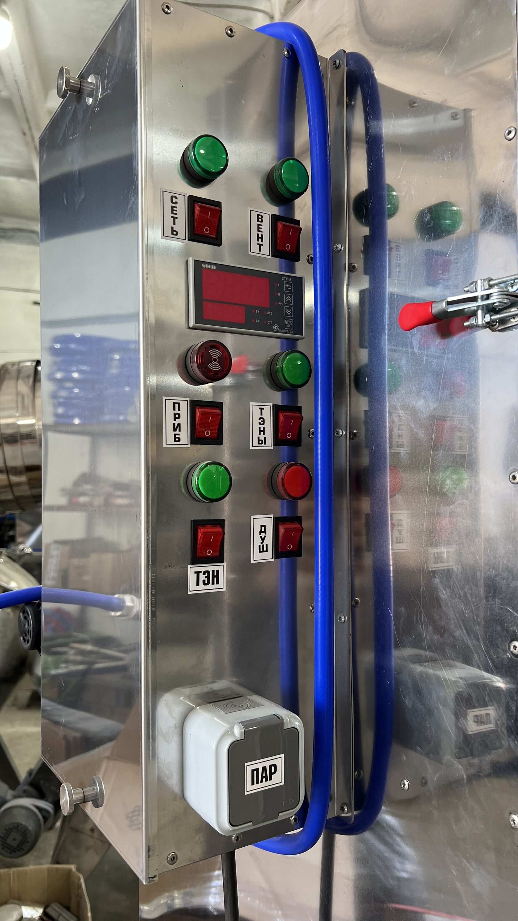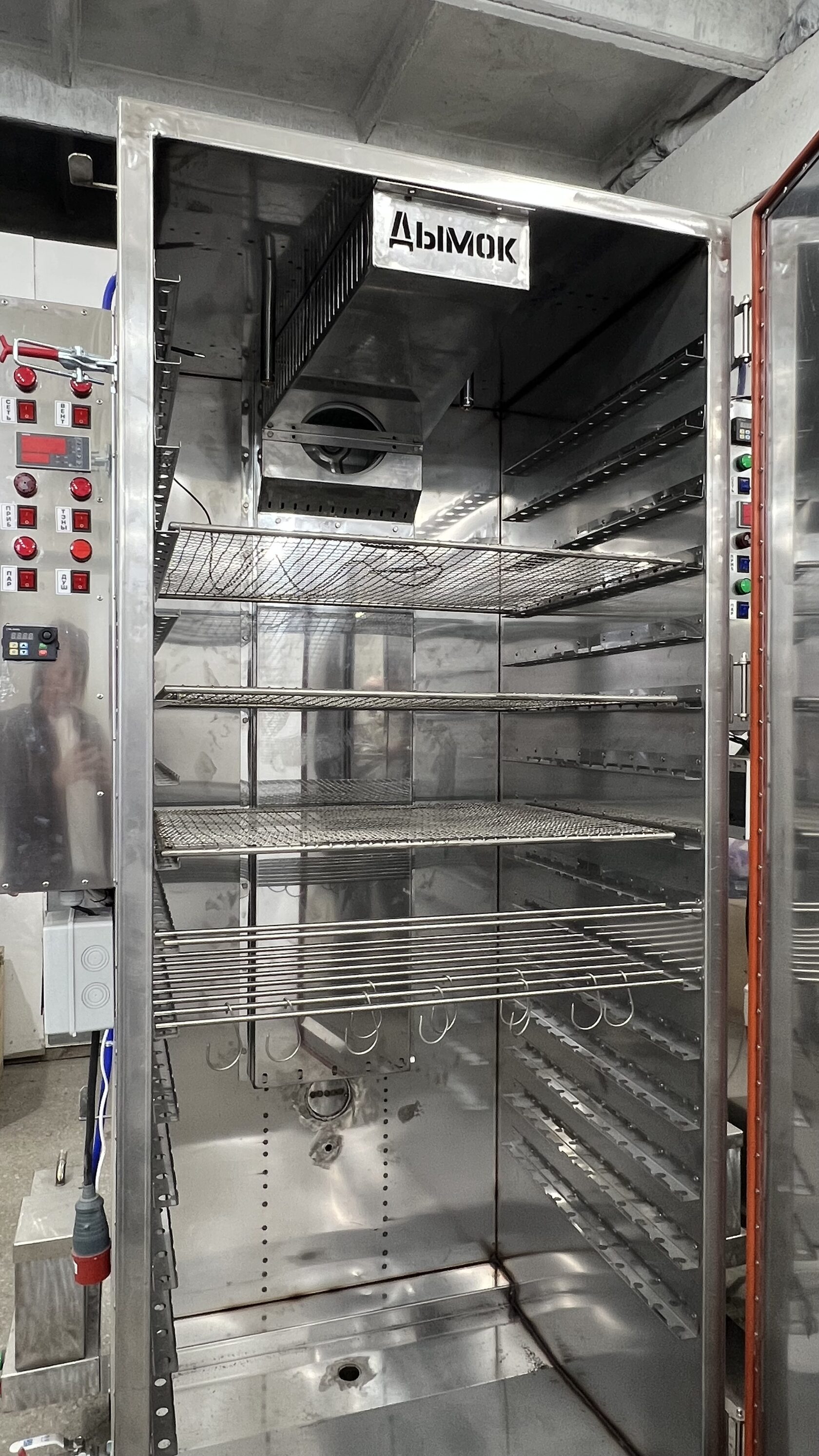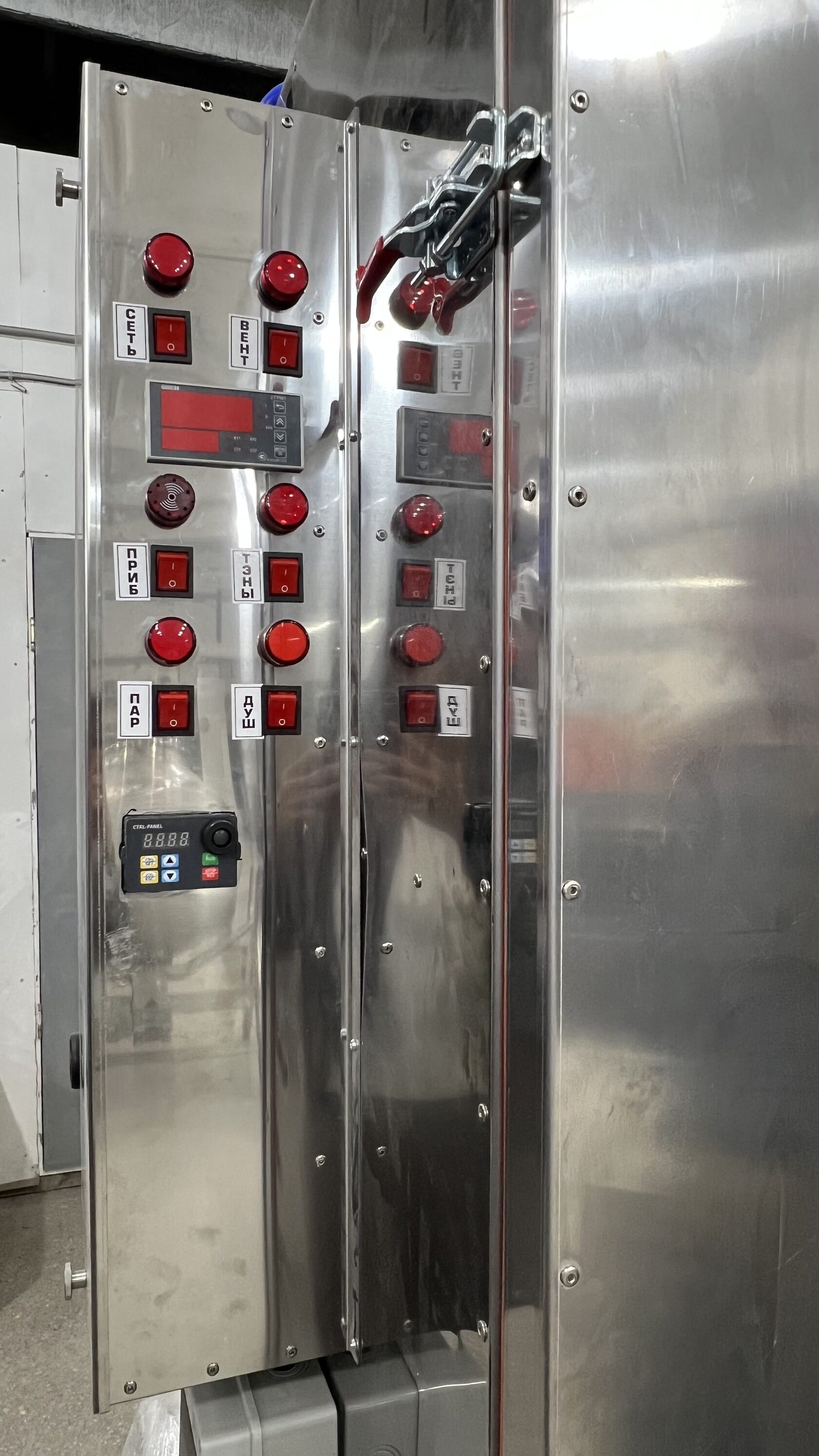 Оборудована : -щитовой 380в (потребление камеры 10кВт -парогенератор в комплекте с подпиткой воды и защитой от выкипания 1,3кВт) -прибор на 2 датчика: t°продукта и t°камеры (камера отключается при достижении заданной температуры) - 2мя форсунками и насосом повышения давления для душирования и мойки камеры. -кассетным дымогенератором из металла с зольником (маx дымление кассеты не более часа) - 30 шампуров - 50 крючков - 2 отвода и труба 50см для дымогенератора. - гофра 3 метра Стоимость указана за полную комплектацию