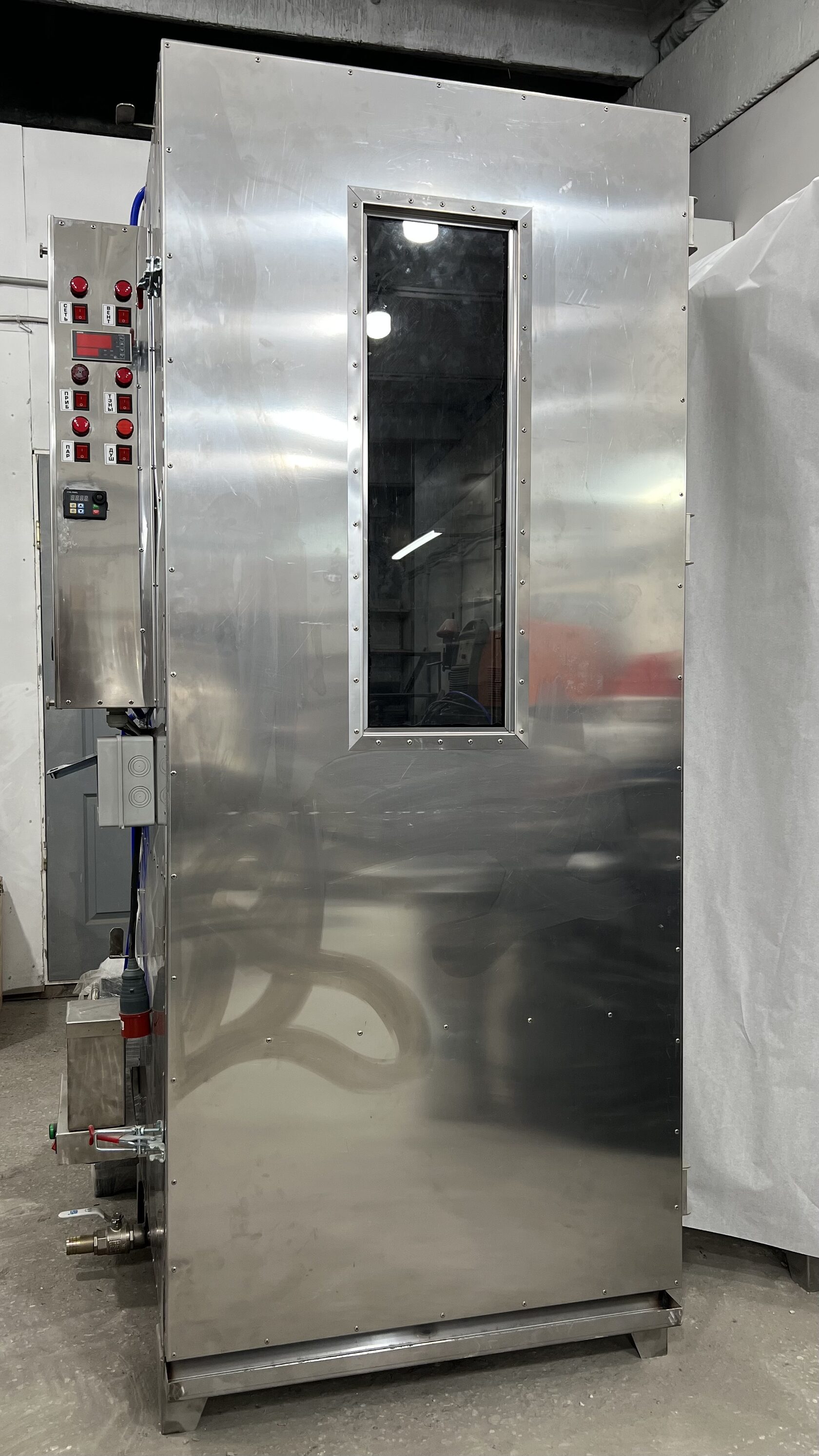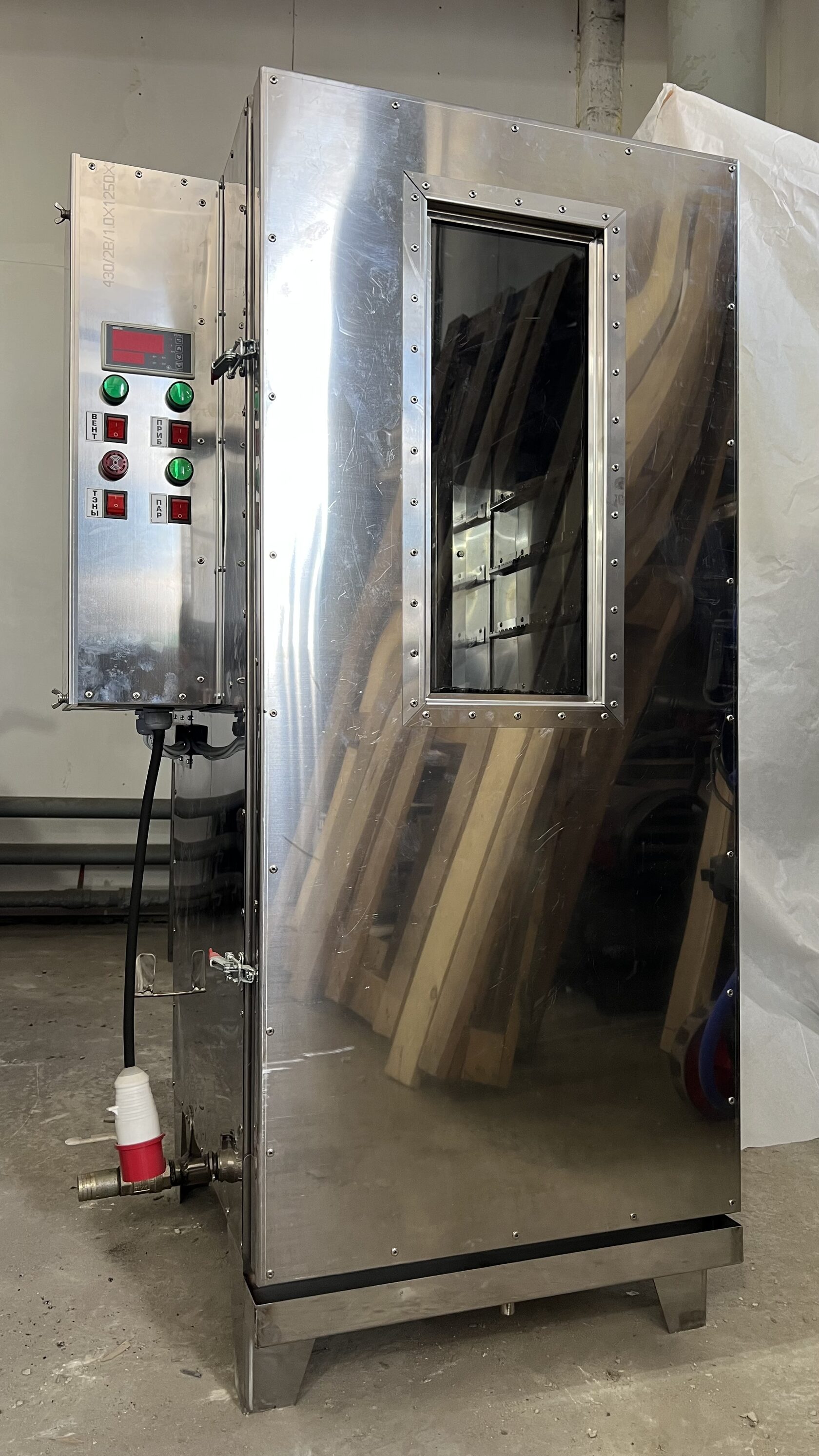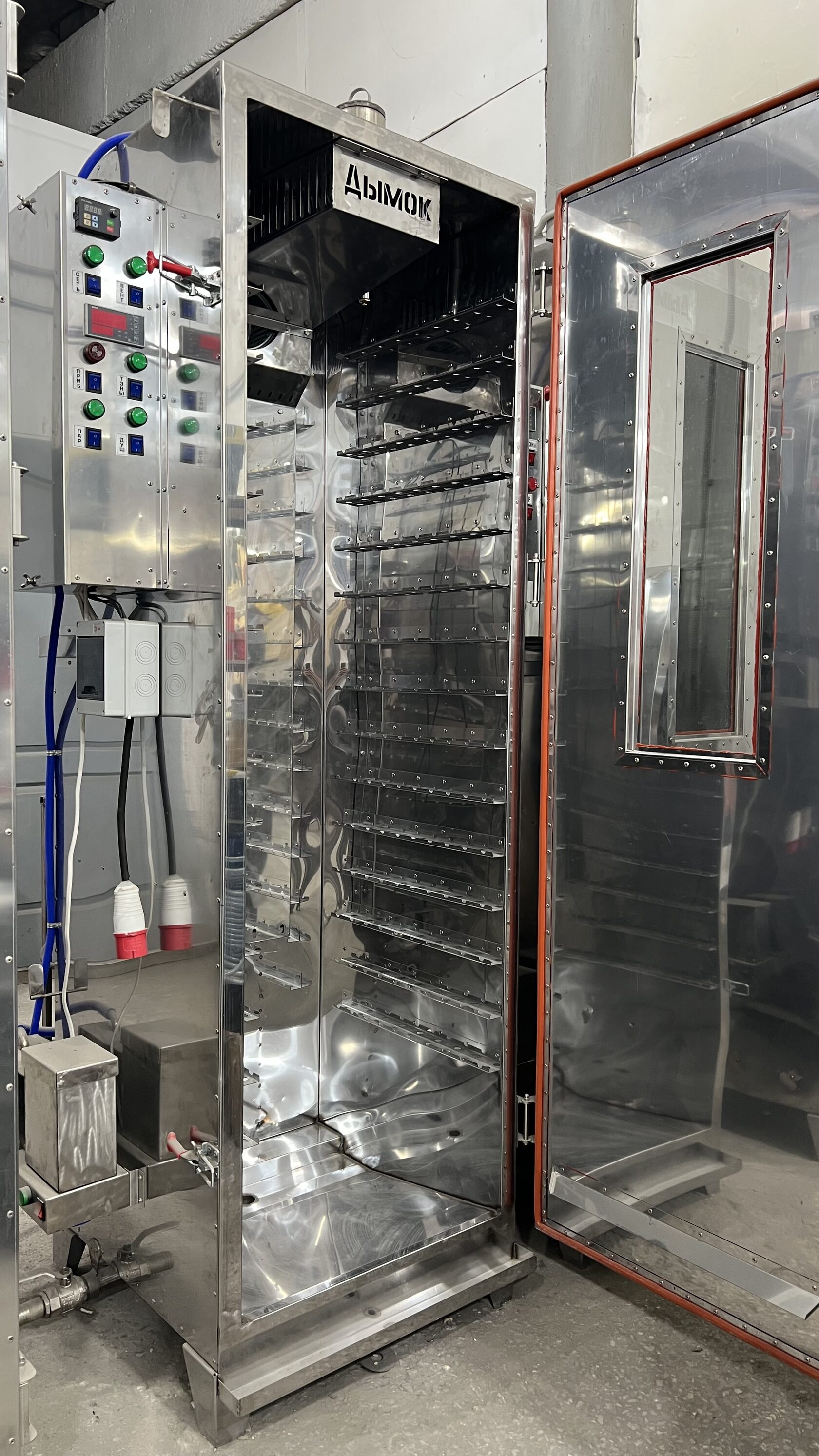 Камера горячего и холодного копчения с загрузкой до 130 кг Внутренние размеры камеры: -ширина 750мм -глубина 750мм -высота 1800мм Камера на 1012 литров. Обшита снаружи нержавеющей сталью , стенка толщиной 40мм утеплена , что позволяет работать при минусовых температурах. Хорошо справляется с сушкой варкой и копчением.